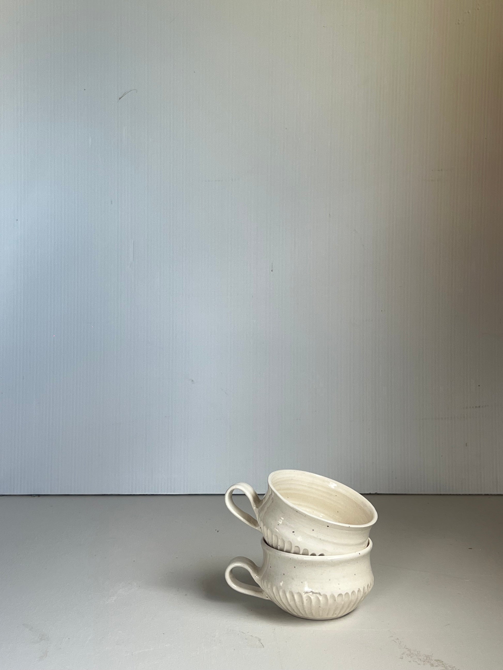 Fluted cups, carved as thin as possible to create a lightweight and elegant shape. Made from a clay with a slight speckle to create interest and easy to mix and match with the classic cup.