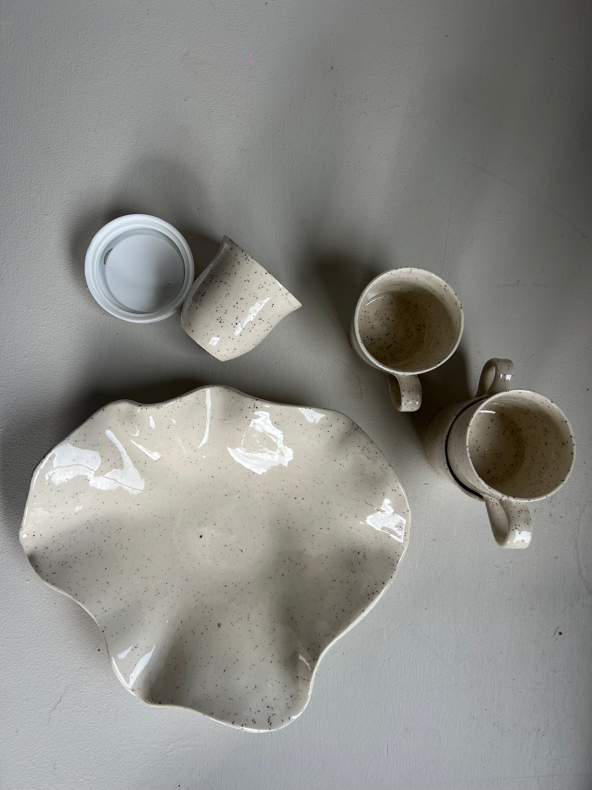 A classic and well loved item is this wavy salad bowl, but with the twist of the added speckles, which is black sand from beaches around Lake Taupō.
